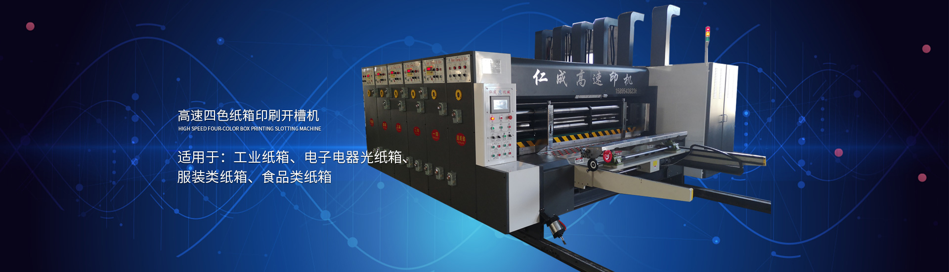 主要產(chǎn)品: 紙箱印刷開槽機(jī), 高速印刷開槽模切機(jī),自動(dòng)插格機(jī),釘箱機(jī),粘箱機(jī),仁成包裝機(jī)械,紙箱機(jī)械